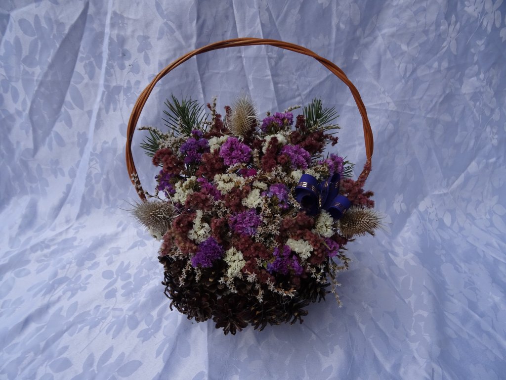 Košíček je zdobený umělými větvičkami borovice, smrkovýma šiškama, staticí a barveným zlatobýlem.