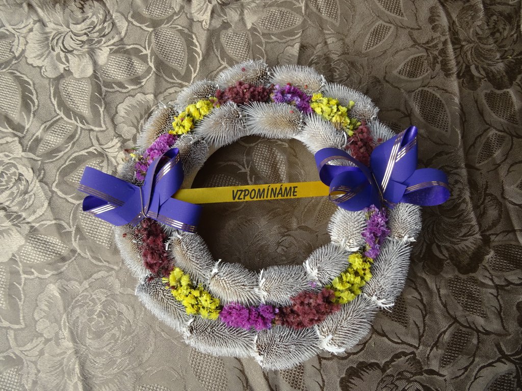 Věnec je zdobený slaměnkama, barveným zlatobýlem, staticí tatarikou a staticí sinuatou.