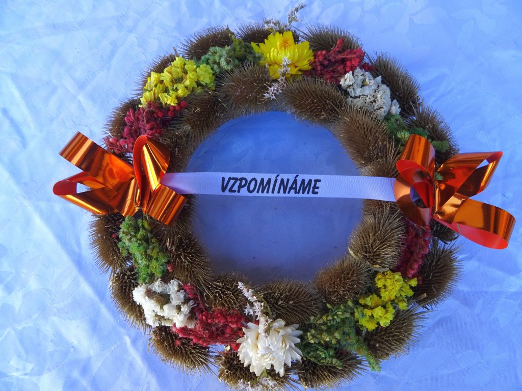Věnec je zdobený slaměnkama, barveným zlatobýlem, staticí tatarikou a staticí sinuatou.